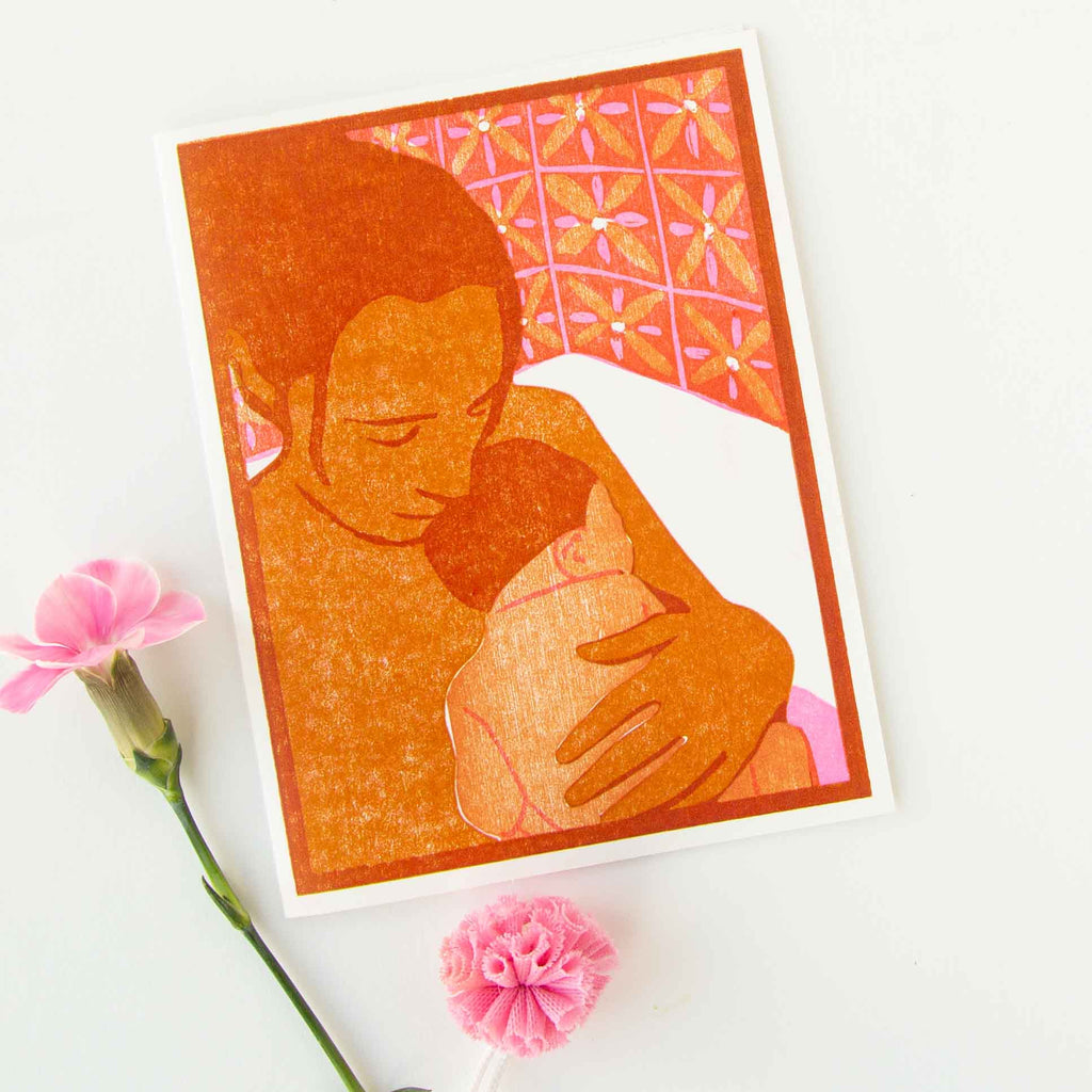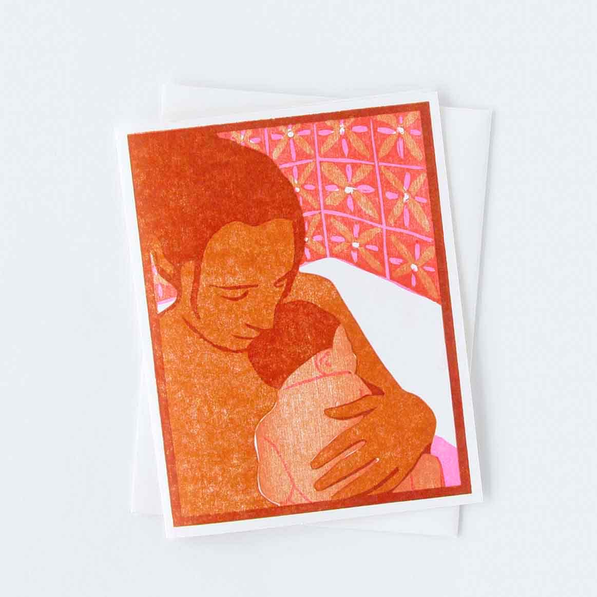 A quiet, intimate moment between parent and child. This card honors the tenderness of early days with a newborn, perfect for new baby congratulations, postpartum support, or celebrating a growing family.