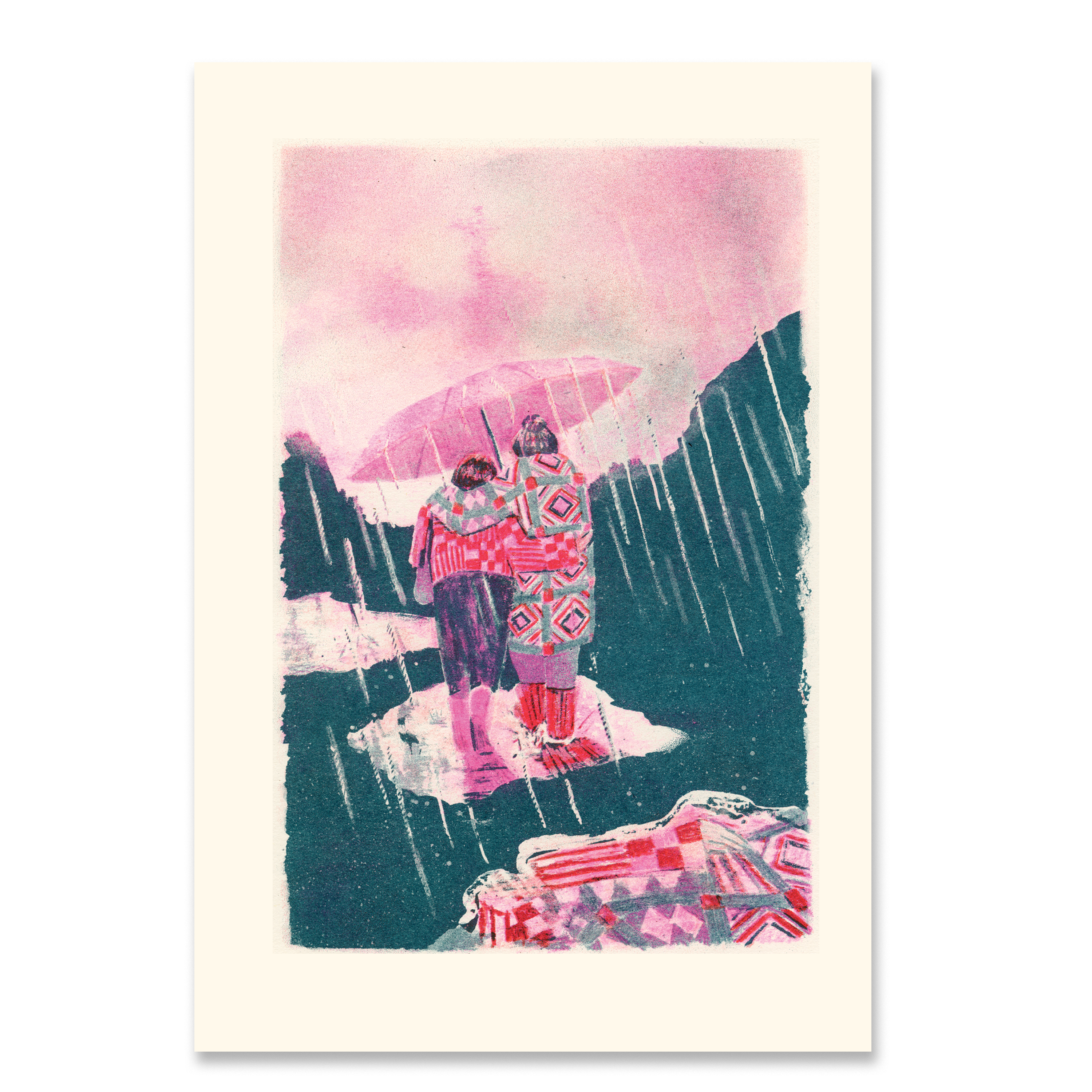 Risograph art print celebrating the quiet comfort of walking through life together. Two figures share an umbrella in the rain, wrapped in patchwork coats stitched with care.