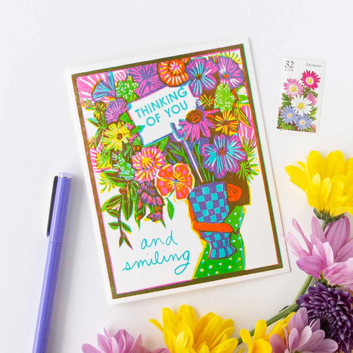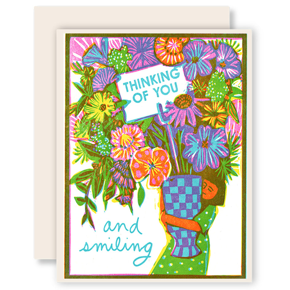 Letterpress, 100% post-consumer recycled paper, A2, blank inside, cello sleeve with envelope.